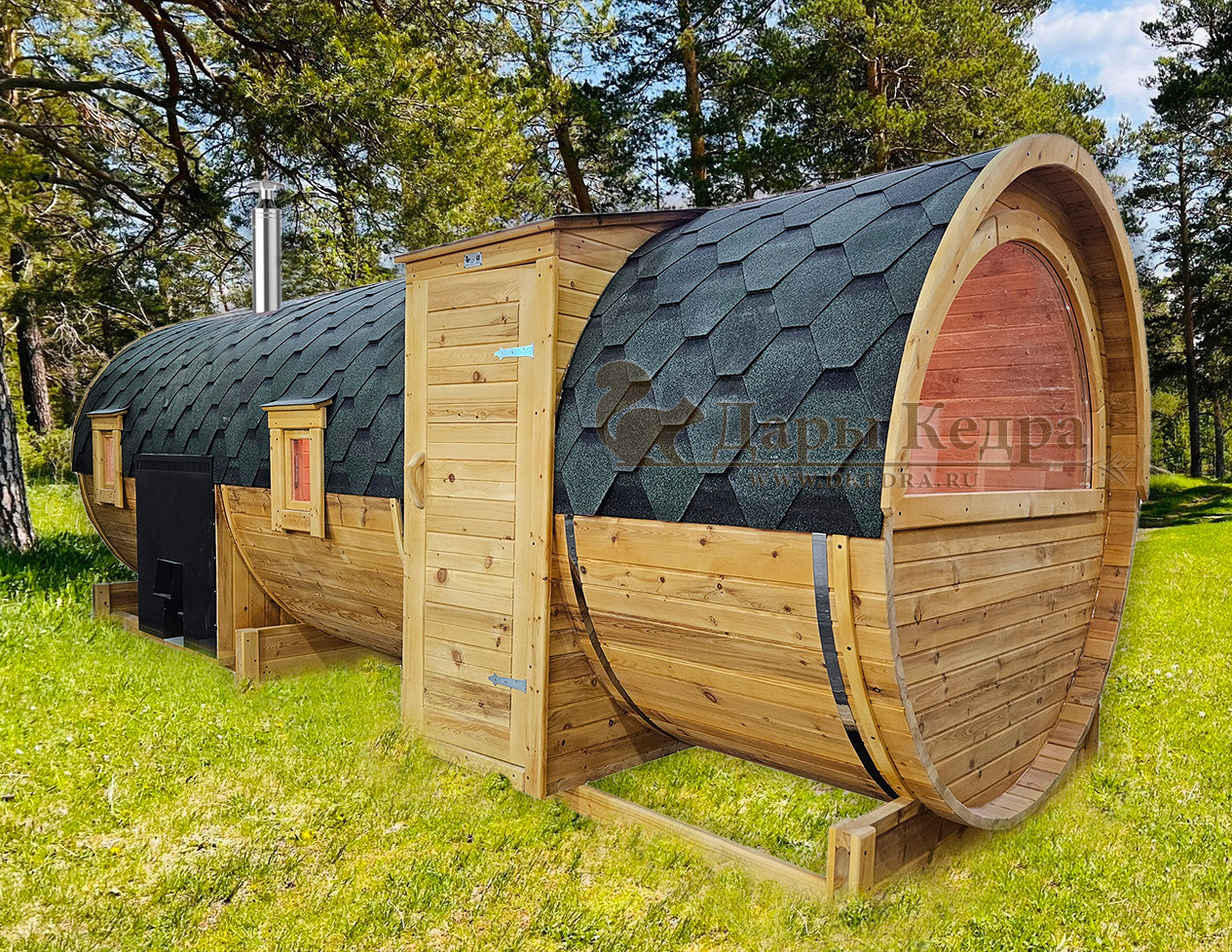 • Баня-бочка «Пентагон» с панорамным окном Стильная и современная баня-бочка может быть выполнена длиною от 4 метров, с двумя отделениями (парилка и комната отдыха). Полок может быть, как с двух сторон, так и угловой, в стандарте двухуровневый. Печь в данной модели расположена сбоку с топкой внутрь парилки, либо наружу или в соседнее помещение. Печь можно укомплектовать баком для воды, а саму баню сделать длиною до 6 метров, комфортно разместив в ней дополнительно помывочную. Панорамное окно на входе добавит света и уюта в раздевалке. Установив баню в живописном месте, во время процедур можно наслаждаться видами из окна. В эту модель включено одно закаленное квадратное стекло в комнате отдыха. Обращаем Ваше внимание, по умолчанию в данной модели отсутствует бак для воды, вместо него идёт утеплённая термо-труба, которую можно заменить на бак по желанию.