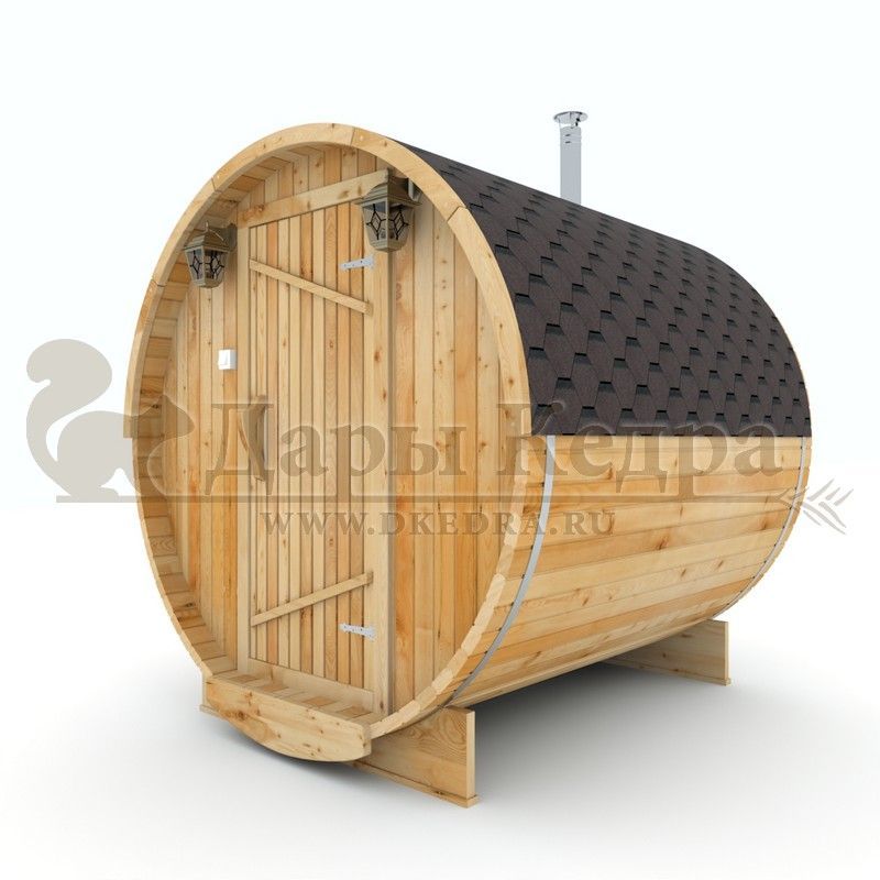Это изделие круглой вытянутой формы с одним парильным отделением. Внутреннее пространство включает в себя печь у дальней стены и лавки из кедра по обе стороны бани. За счет компактной формы баня нагревается в течение 30 минут. По вашему желанию ее можно укомплектовать козырьком, верандой и печью с внешней загрузкой, благодаря которой весь мусор после топки остается на улице. Круглая баня-бочка не требует полноценный фундамент, поэтому при необходимости ее можно перенести в другое место.