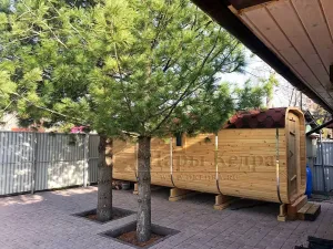 Это прямоугольное изделие с закругленными углами. За счет такой конструкции во время топки воздух циркулирует по кругу, поэтому баня-бочка нагревается не более 30 минут. Баня включает в себя раздевалку, моечную и парную. Во всех трех отделениях лавочки из кедра установлены с обеих сторон. Печь расположена в парилке около дальней стены. Для удобства пользования в бане висят полочки из кедра и вешалка в раздевалке. По вашему желанию баню-бочку квадро можно укомплектовать козырьком, верандой и печью с внешней загрузкой, благодаря которой весь мусор после топки остается на улице. Баня-бочка квадро не требует полноценный фундамент, поэтому при необходимости ее можно перенести в другое место.