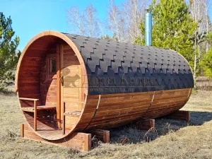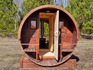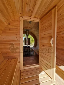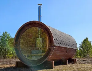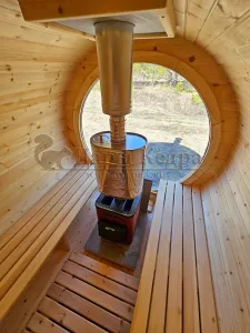 Стильная и современная баня-бочка может быть выполнена длиною от 3 метров, что-бы парильное отделение было не менее 2,5 метров для безопасного расстояния человека от печи. Полок одноуровневый, что позволяет в полной мере наслаждаться видом из панорамного окна. Печь идёт с внутренней топкой по центру, её можно установить сбоку с топкой внутри, снаружи, либо вынести топку в соседнее отделение. Печь можно укомплектовать баком для воды, а саму баню сделать длиною до 6 метров, комфортно разместив в ней дополнительно помывочную и комнату отдыха.