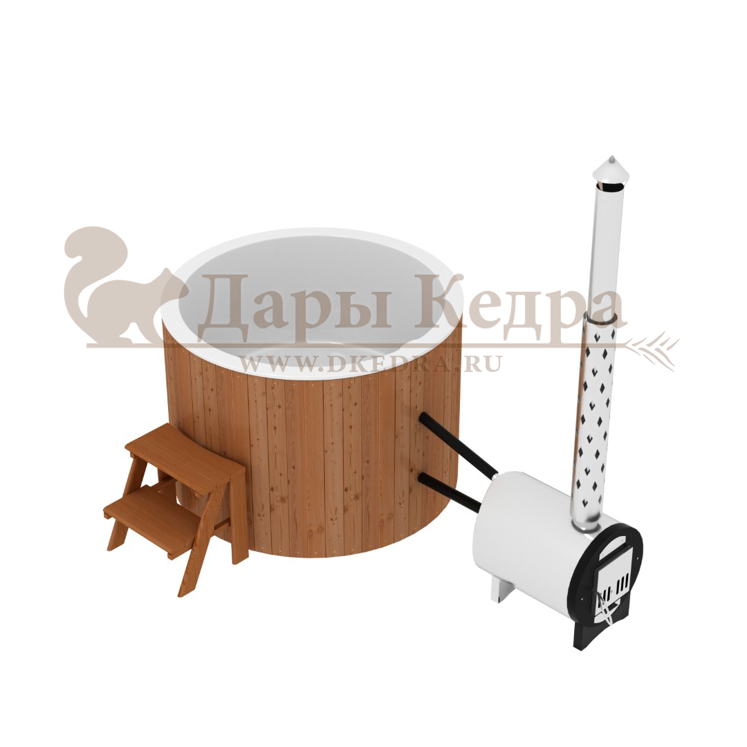 Фурако круглая из кедра с термопластиковой вставкой со встроенной печью Это уличная подогреваемая купель с круглой внутренней чашей из термопластика. Для удобства пользования купель оборудована лавочками, приставной и внутренней лестницей. Нагрев воды происходит за счет встроенной печи, которая находится внутри купели за перегородкой. В комплектацию этой модели входит савок с длинной ручкой, который позволяет извлекать угли после эксплуатации изделия. Термопластик устойчив к воздействию температур, облегчает уход за купелью и увеличивает срок ее службы. Парение на свежем воздухе – это отличный способ укрепить здоровье и поддержать организм в тонусе.