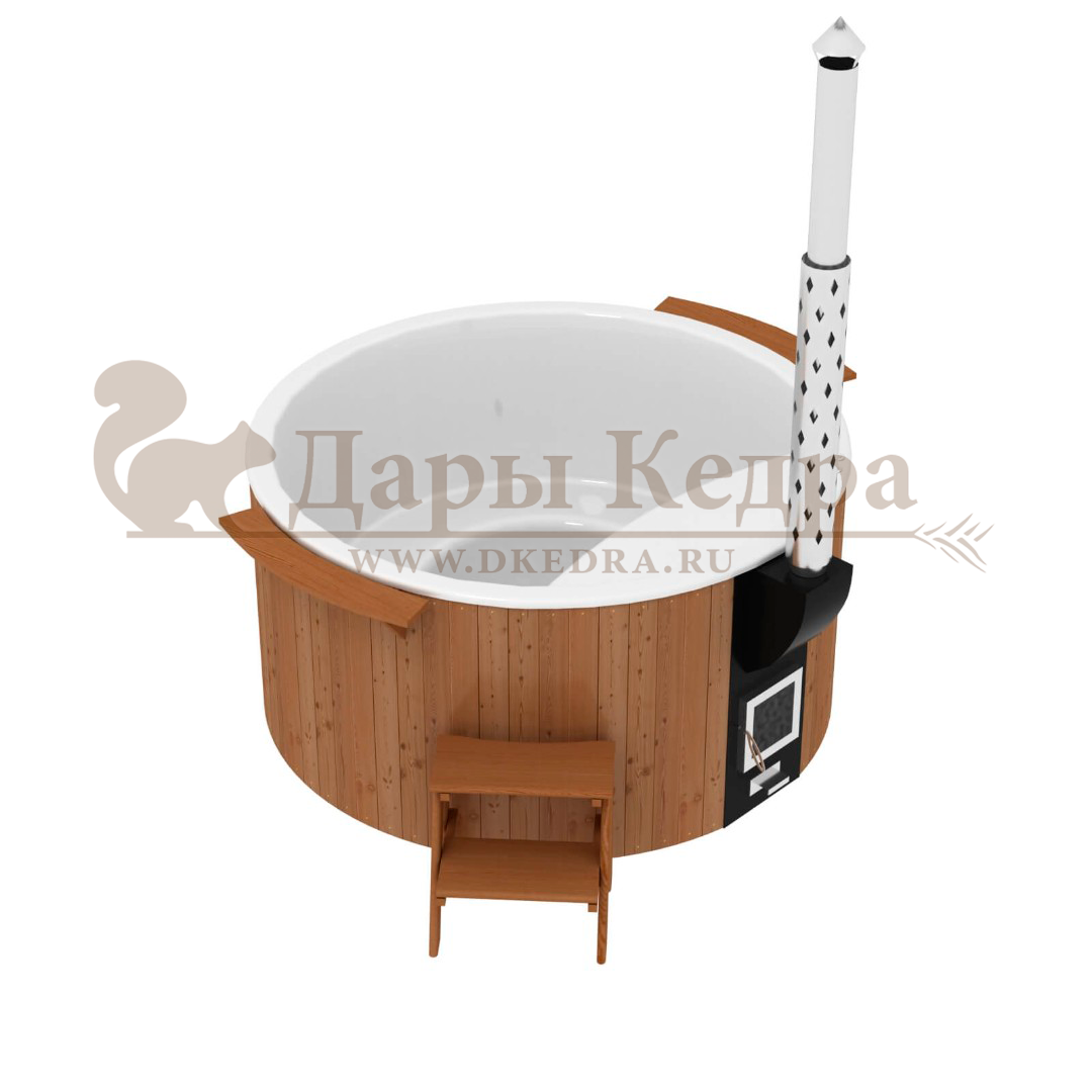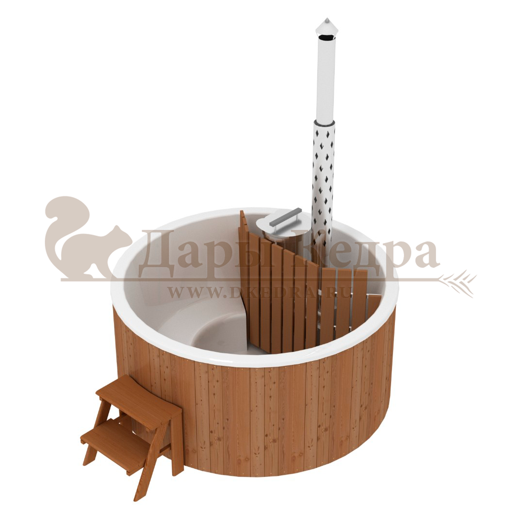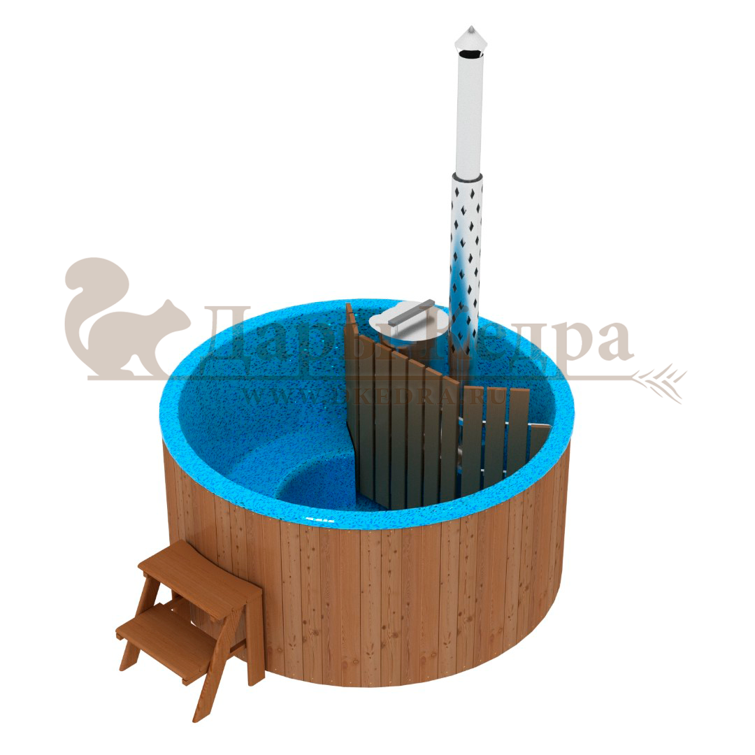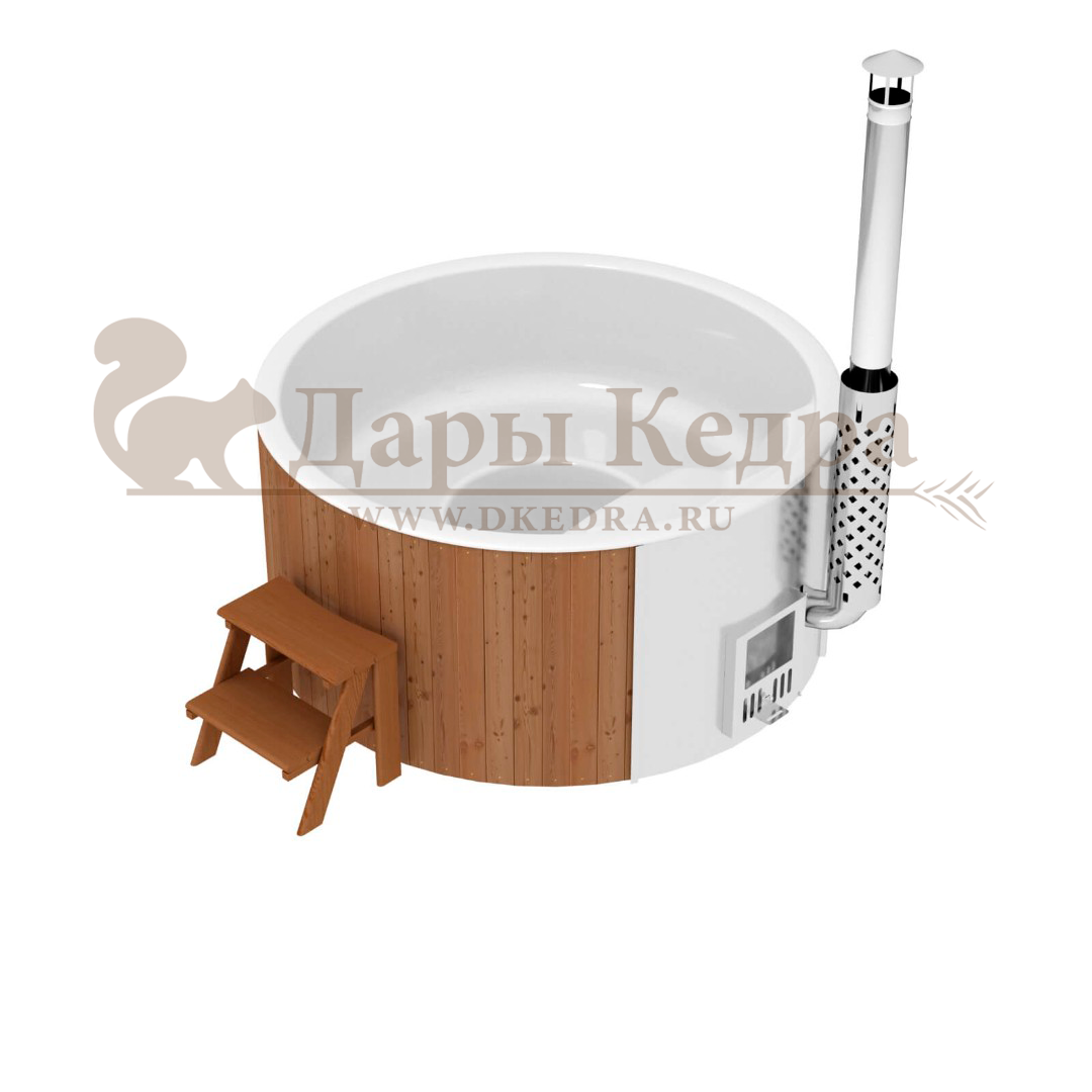 Финская круглая композитная купель с подогревом (с печкой) «Премиум 220 30 квт» Это уличная подогреваемая купель с круглой внутренней чашей, которая изготовлена из современного прочного и термоустойчивого материала (композита). Форма чаши обеспечивает комфортную посадку во время принятия процедур. Для удобства пользования купель фурако оборудована приставной лестницей. Нагрев воды осуществляется за счет встроенной печи, которая находится внутри купели за перегородкой из кедра. В комплектацию этой модели входит савок с длинной ручкой, который позволяет извлекать угли после эксплуатации изделия. Композитная вставка придает купели красивый внешний вид, продлевает срок службы и облегчает уход за изделием. Парение на свежем воздухе – это отличный способ укрепить здоровье и поддержать организм в тонусе.