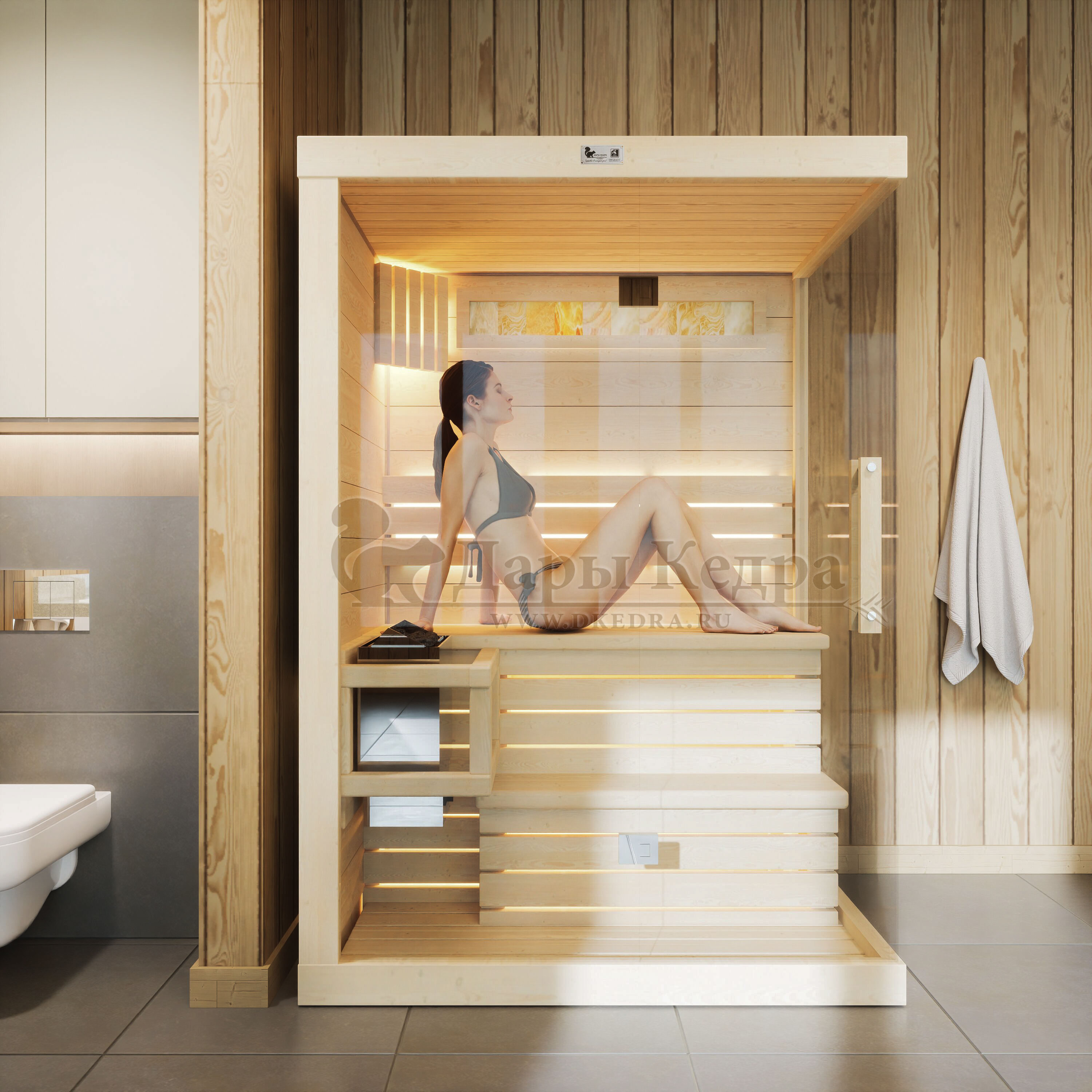 Одноместная прямая финская «Элит» сауна кабина из кедра и липы с электрокаменкой Это специально оборудованная готовая деревянная кабина для сухого и влажного парения. Электропечь нагревает пространство внутри и позволяет сбрызгивать камни водой, слегка увлажняя воздух. Такая процедура позволяет избежать перегрева. Каркас сауны выполнен из массива кедра, снаружи и внутри обшит липовой вагонкой сорта «Экстра» и имеет теплоизоляционный слой. Также двухуровневый полок идёт из кедра для обогащения внутри кабины полезными фитонцидами, а в сочетании с противовирусными свойствами липы сауна становится настоящим источником здоровья. Закаленный цельностеклянный фасад с безрамной дверью является термостойким и придает конструкции легкость и обзорность. Можно добавить боковую стенку, как на образце 3D модели из термостекла за дополнительную плату. Дополнив кабину панелью из гималайской соли или можжевеловым панно с подсветкой вы получаете красивейший объект в интерьере. Финская сауна с электропечью подойдет, как для домашнего использования, так и для коммерции. Доставляется в разборном виде щитами, собирается по инструкции с помощью шуруповёрта.
